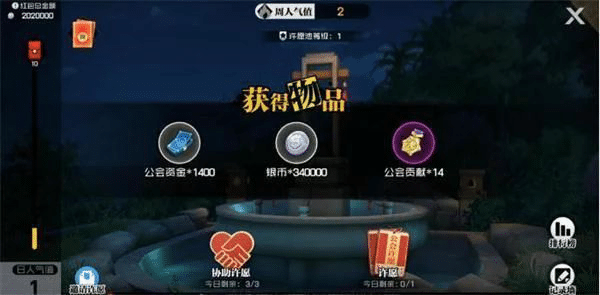 公会许愿是游戏中参与难度最低的玩法之一,玩家点击本活动后即可自动寻路来到许愿池旁,之后点击许愿即可获得银币、公会资金以及公会贡献三部分奖励。除此之外,拜访其他公会协助许愿也能获得非常丰厚的奖励,并为其他公会积累人气值,相对应的日人气值越高,每天晚上9点发放的公会许愿红包奖励就更加丰厚。