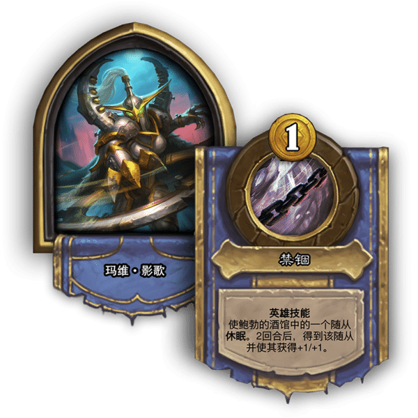 禁锢 [消耗1枚铸币]:使鲍勃的酒馆中的一个随从休眠。2回合后,得到该随从并使其获得+1/+1。