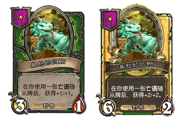 [等级1,野兽]3点攻击力,1点生命值。在你使用一张亡语随从牌后,获得+1/+1。