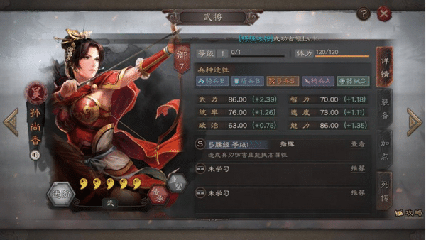 武将介绍:专属战法可以在普攻之前触发兵刃攻击,在有增益效果加持的情况下则可以提升武力值,而传承战法则是联姻,该战法可以提高异性队友的额外治疗效果。