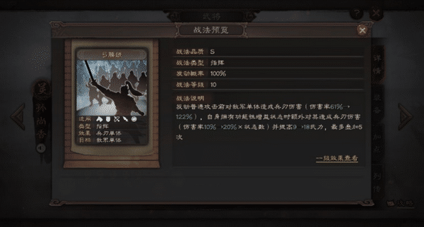 满级效果:发动普通攻击前对敌军单体造成兵刃伤害(伤害率61%—122%),自身拥有功能性增益状态时额外对其造成兵刃伤害(伤害率10%—20%×状态数)并提高9—18武力,最多叠加5次。