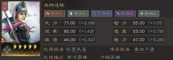 副将马云禄:强攻+瞋目横矛;胜而益强+武略