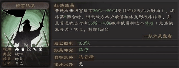 由于马云禄具备5回合后的锁定能力,同时还受敌方兵力减少的加成,所以建议搭配有强续航能力的骑兵武将或战法,如刘备、祝融、象兵、八门金锁阵、暂避其锋,等等。